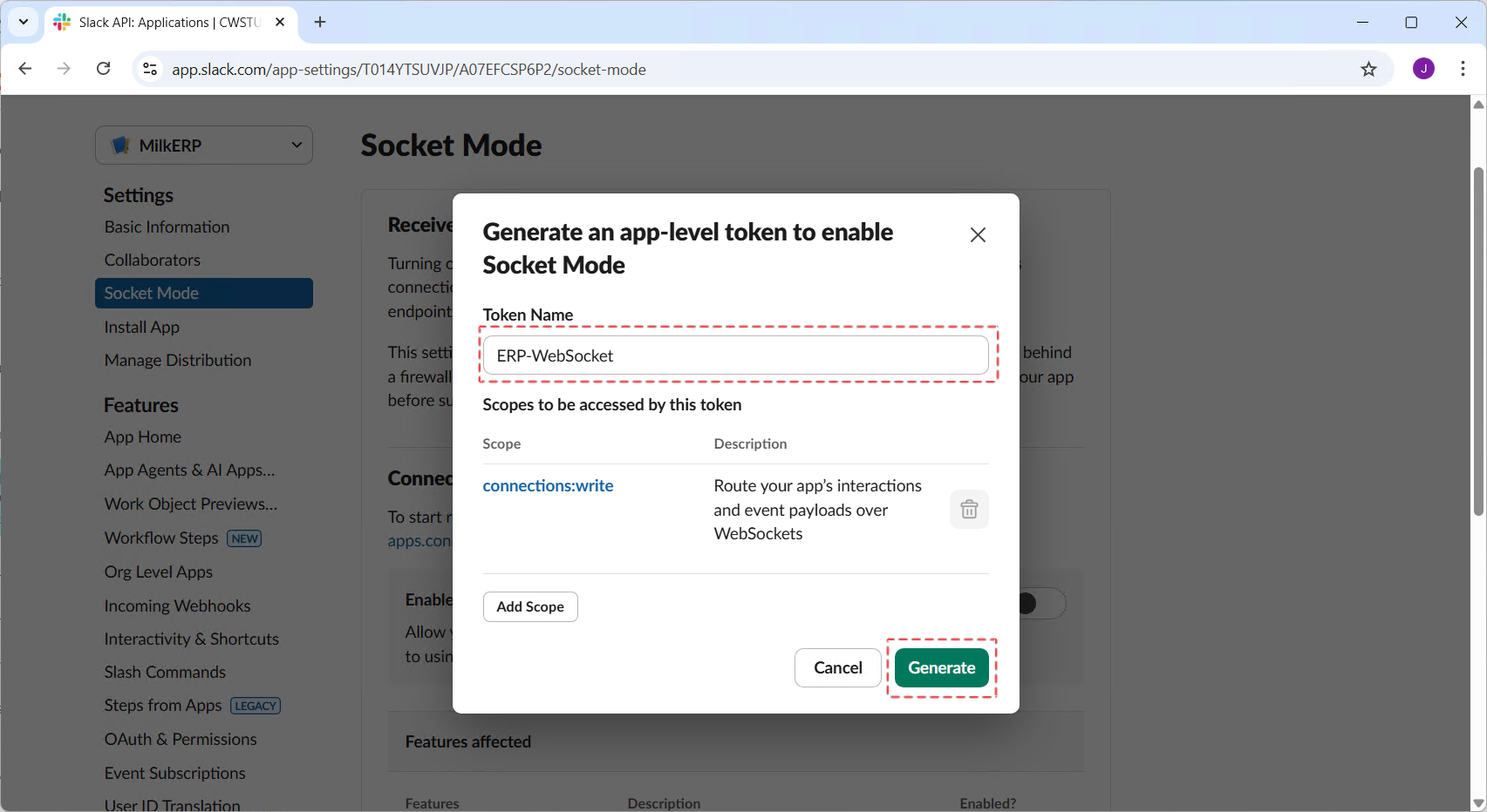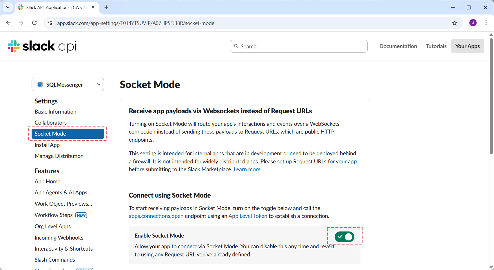 Step 2: In the app management page, click “Socket Mode”, then turn on the “Enable Socket Mode” switch.