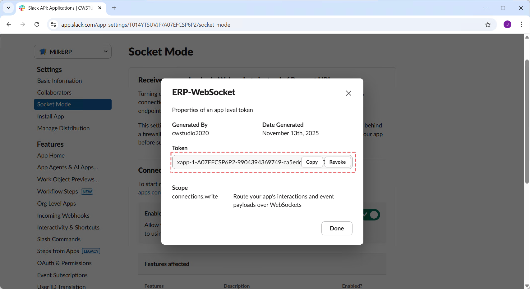 Note: This token is the Socket password for your app. Please store it securely to prevent information leakage or potential losses.
