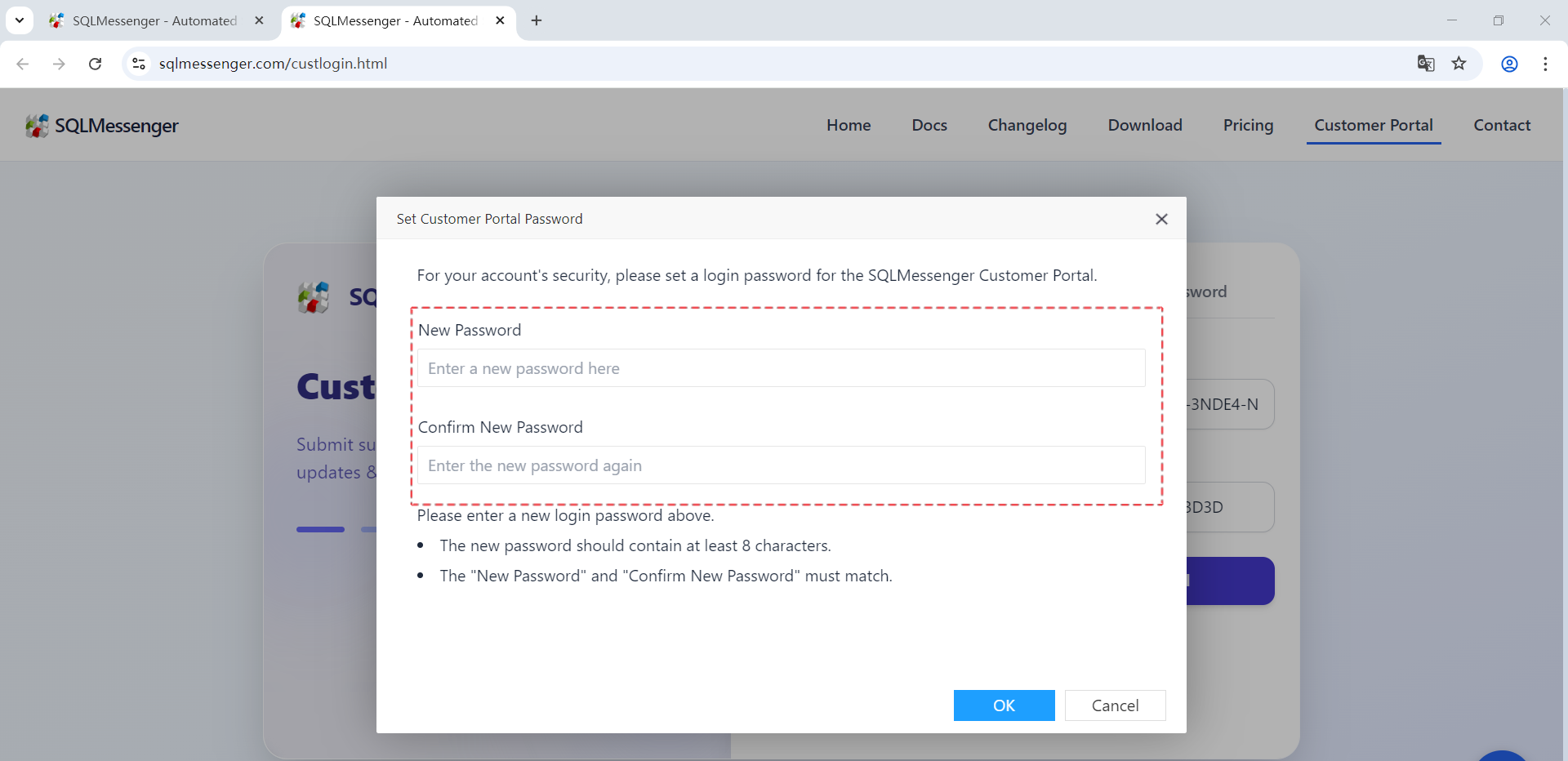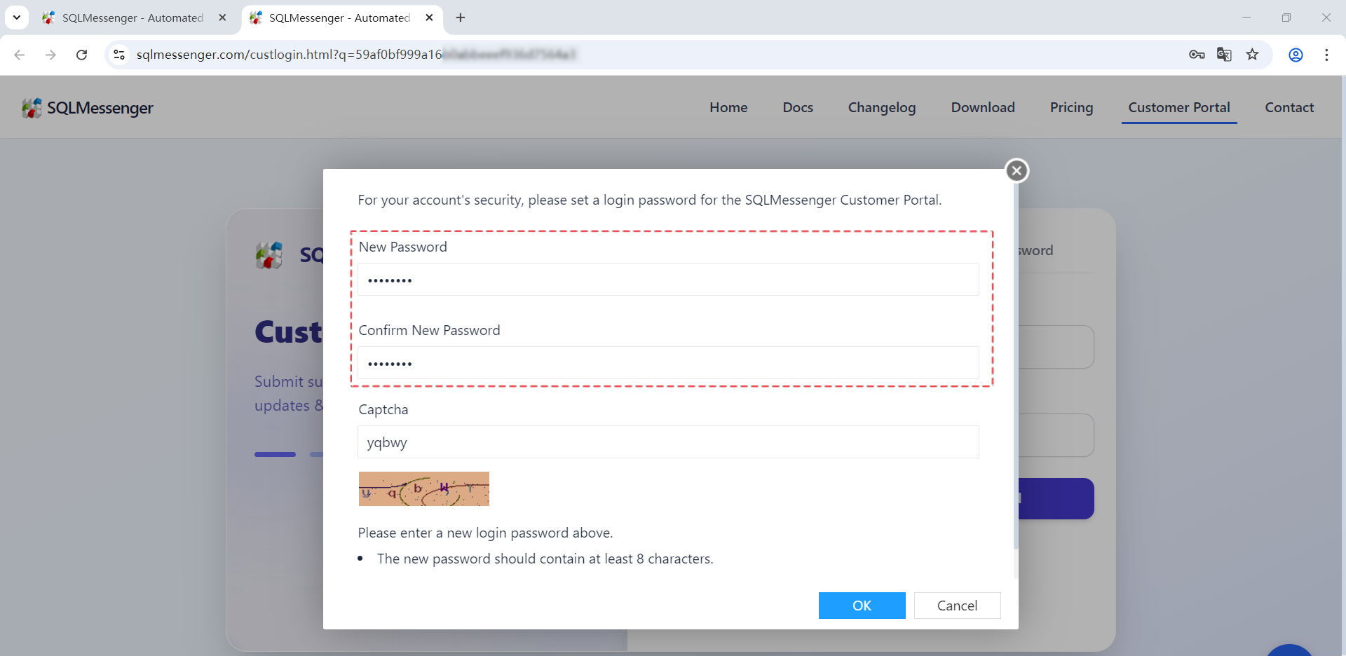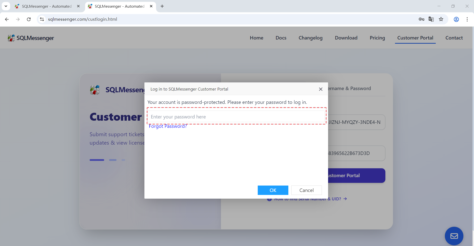 Then, click the "Login to the SQLMessenger Customer Portal" button in the dialog. The system will open the Customer Portal login page in your browser.