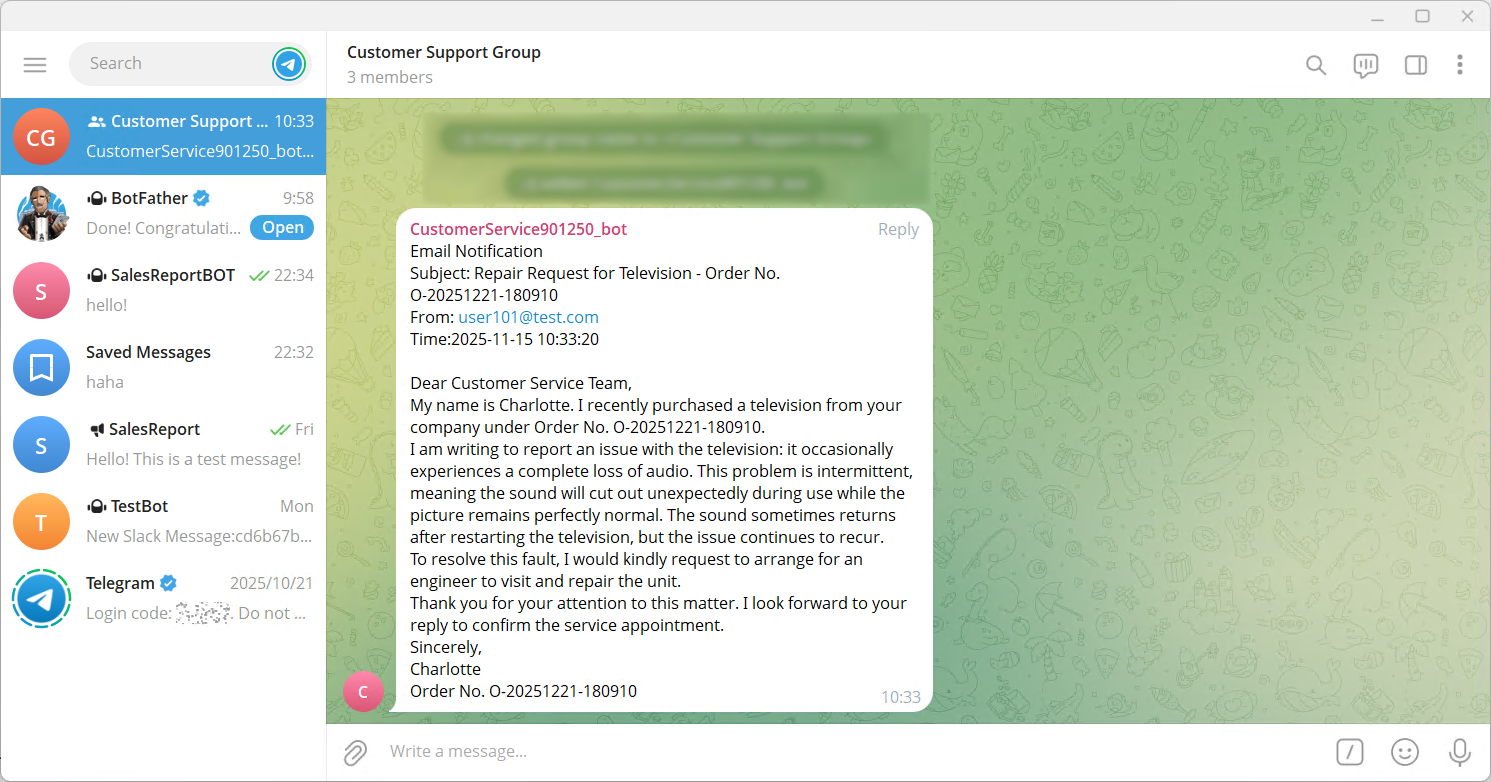 Once configured, SQLTelebot will forward the basic email information, email body, and attachments to the Customer Support Group whenever a new email arrives.