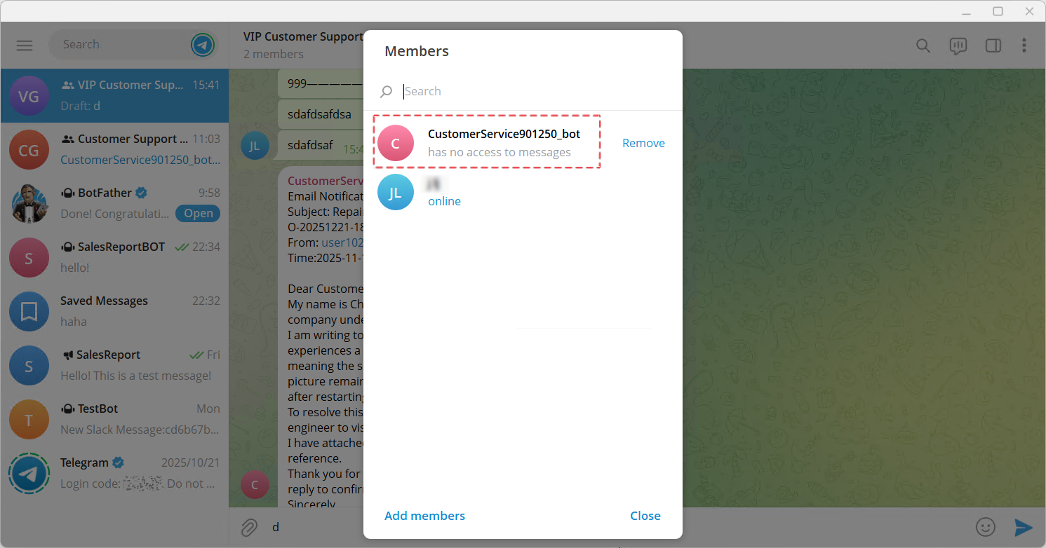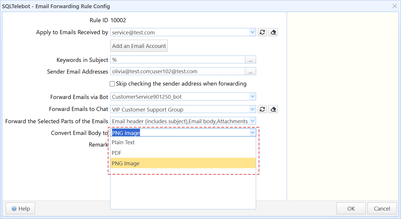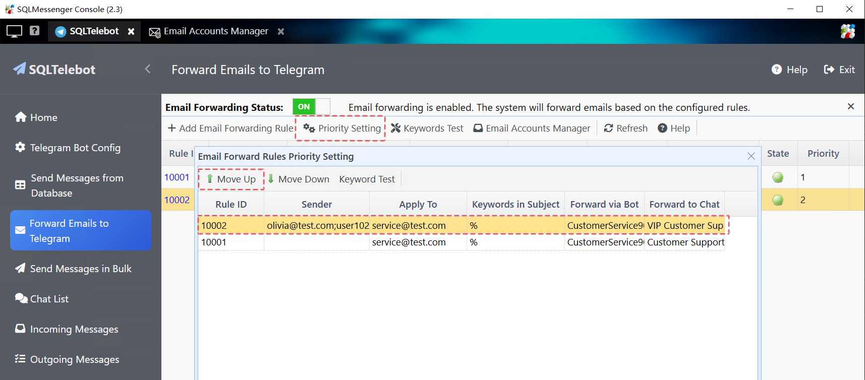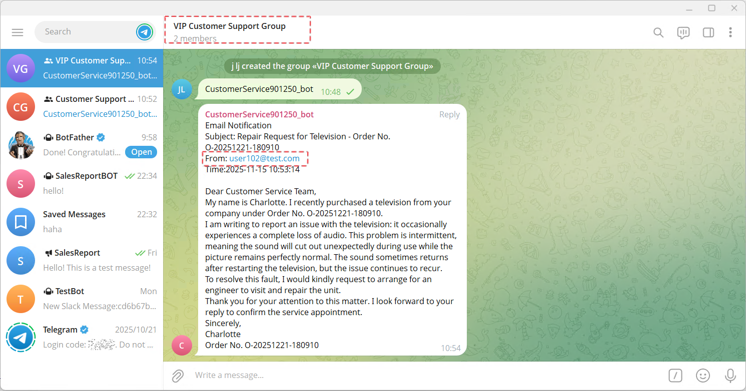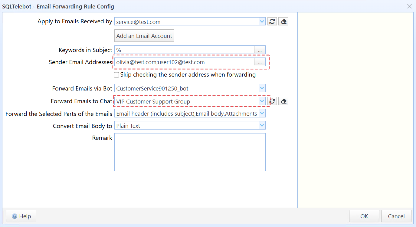 From then on, SQLTelebot will forward emails from addresses such as olivia@test.com and user102@test.com to the VIP Customer Support Group.