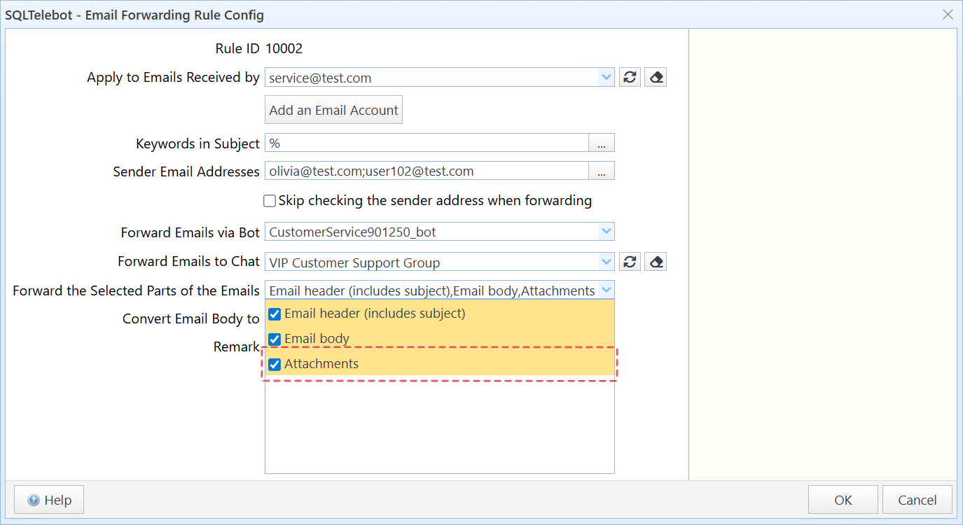 You can also forward email attachments to Telegram. To do this, simply select the “Attachments” option under “Forward the Selected Parts of the Emails” when configuring the forwarding rule.