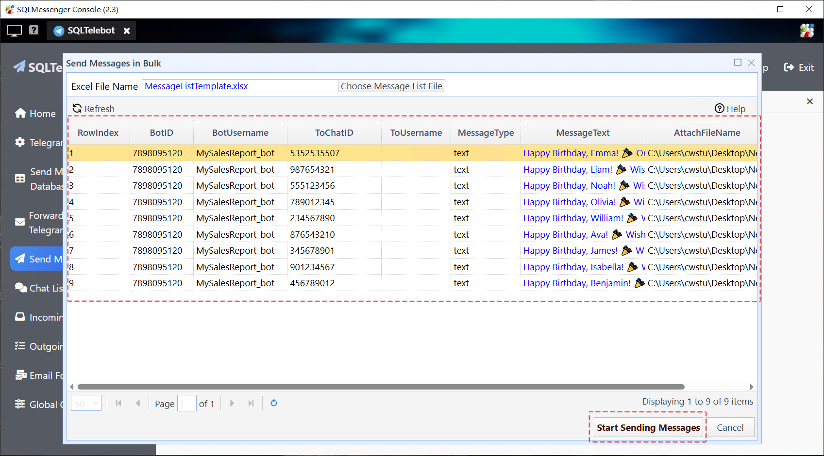 This document demonstrates how to use SQLTelebot to send Telegram messages in bulk.