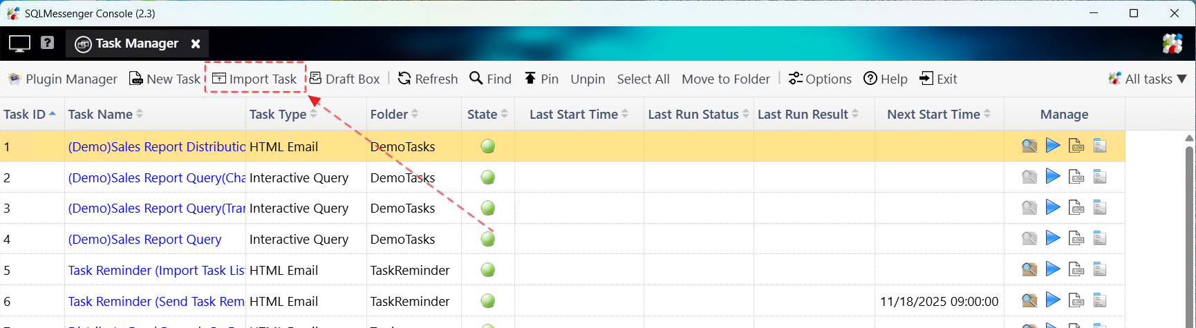 This document demonstrates how to import task configuration files into SQLMessenger.