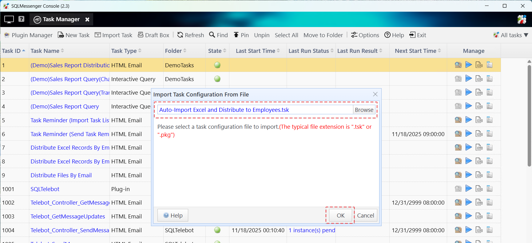 You just need to import these files into your system to use the tasks. When importing, the system will create the corresponding tasks in your SQLMessenger according to the contents of the configuration files.