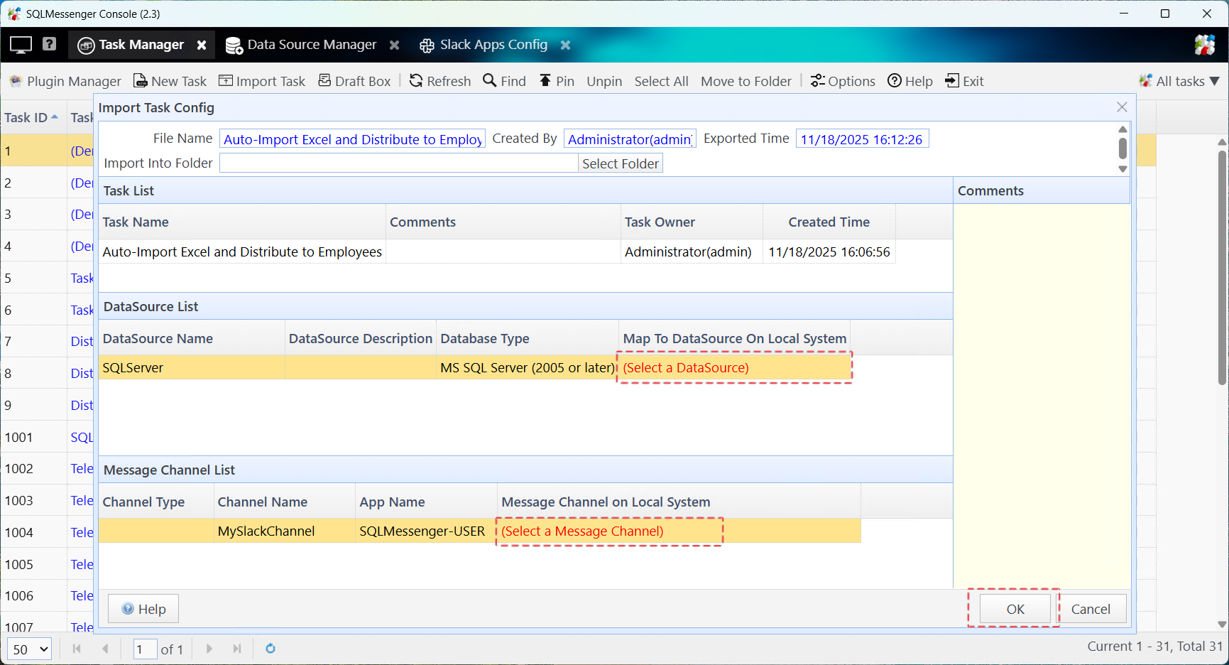 If the configuration file is a “.tsk” file, the system will display a task summary. In this window, select the data source and message channel for the task (if required), then click "OK". The system will import the task into your task list.
