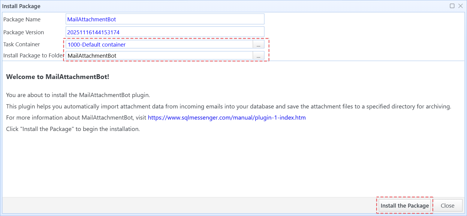 If the configuration file is a “.pkg” file, the system will display the "Install Package" dialog. In this dialog, you can select the task container and installation folder. Then click "Install the Package". The system will start the package installation process.