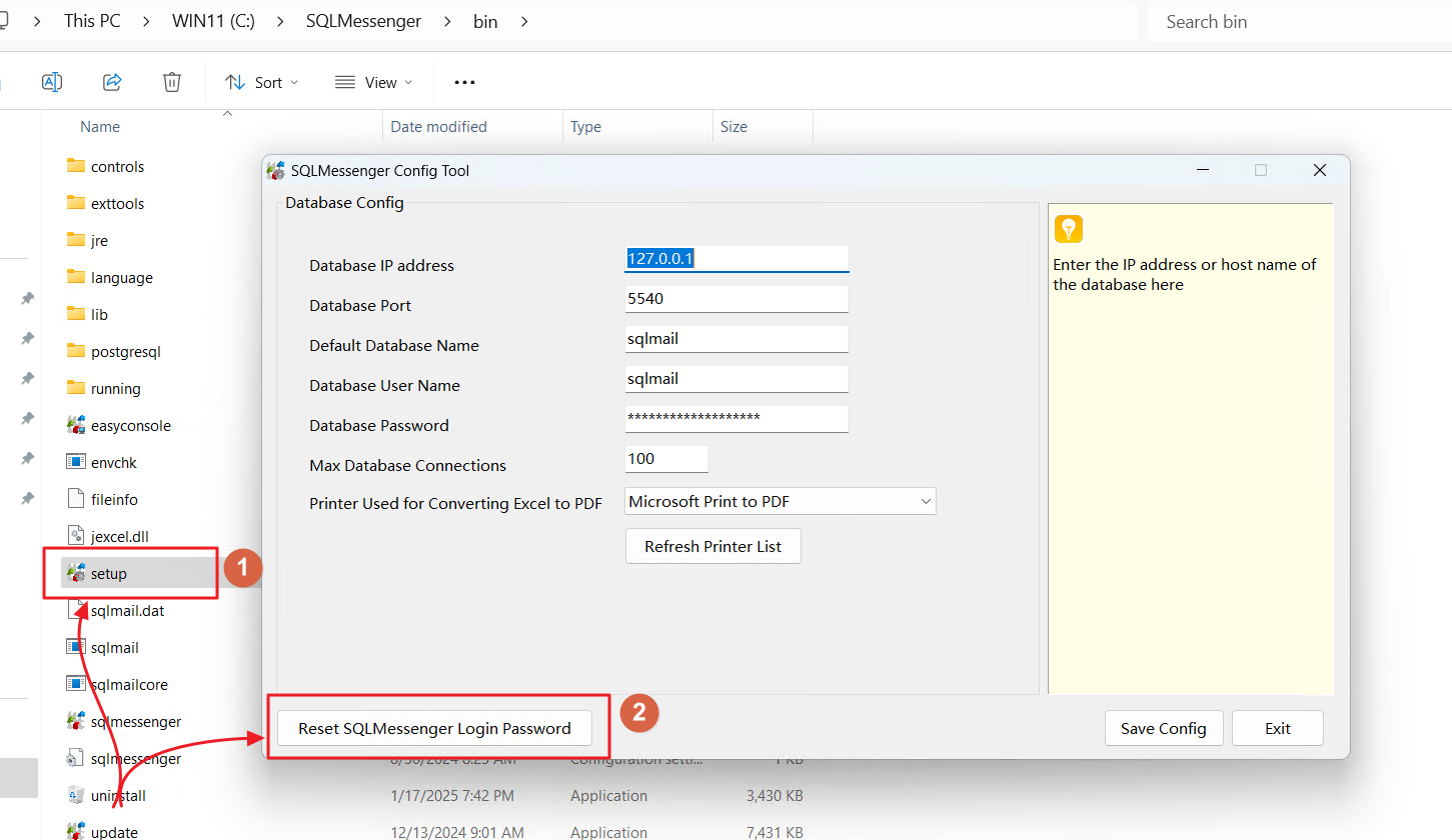 Step2: Run the setup.exe located in the bin folder of the SQLMessenger installation directory. Click on the "Reset SQLMessenger Login Password" button.