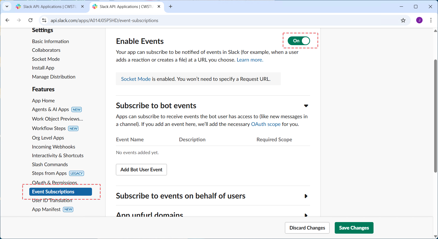 Step 5: Click “Event Subscriptions”, then enable the “Enable Events” option.
