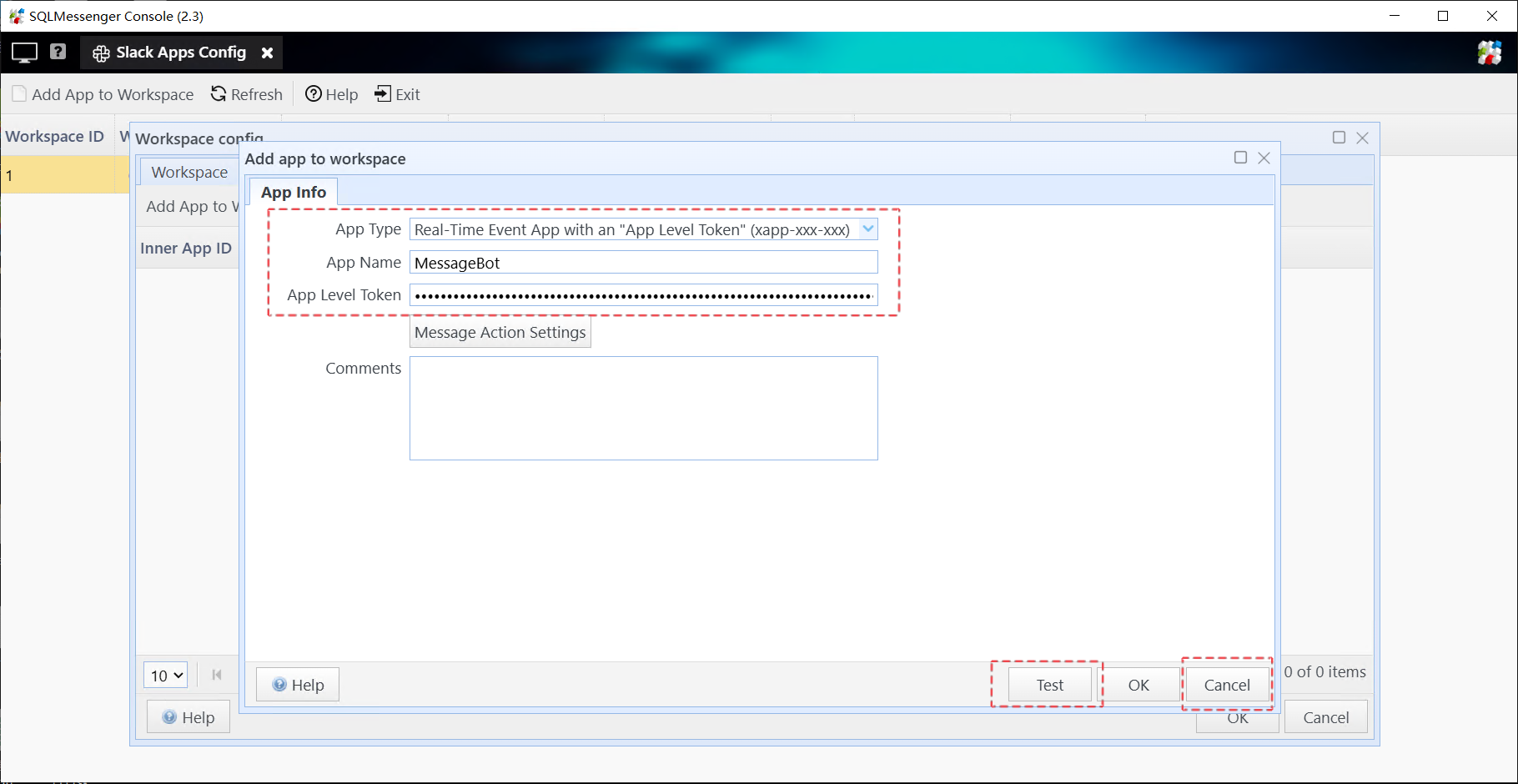 Step 3: For App Type, select “Real-Time Event App with an App Level Token”. Enter the app name and token, then click “Test”. The system will attempt to create a WebSocket connection to Slack using the token you provided. If the test is successful, click “OK”.