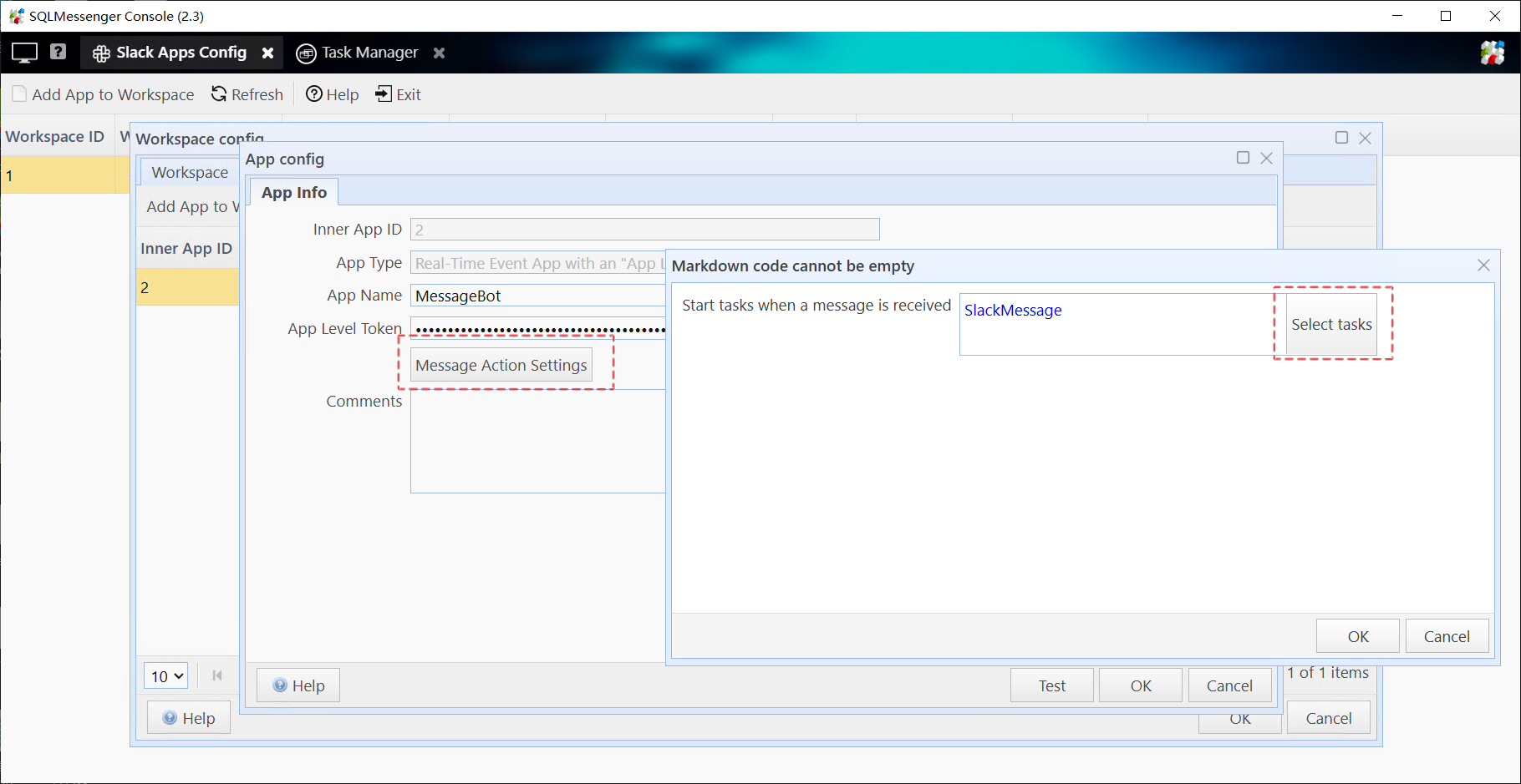 After creating a Slack App, you need to configure the Slack App's connection information in SQLMessenger.