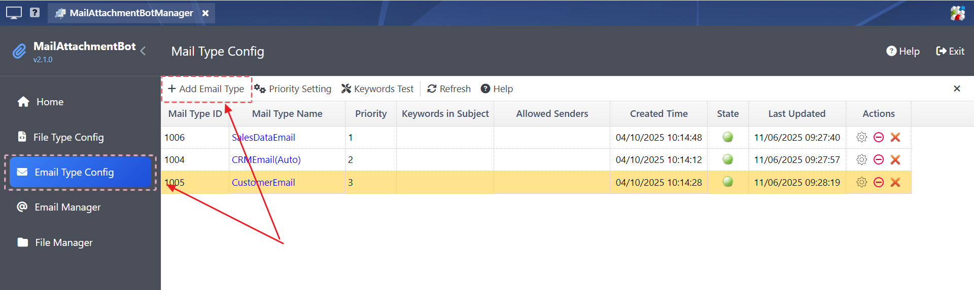 Step 1: In MailAttachmentBot Manager, click Email Type Config, and then click Add Email Type to open the Edit Mail Type dialog box.