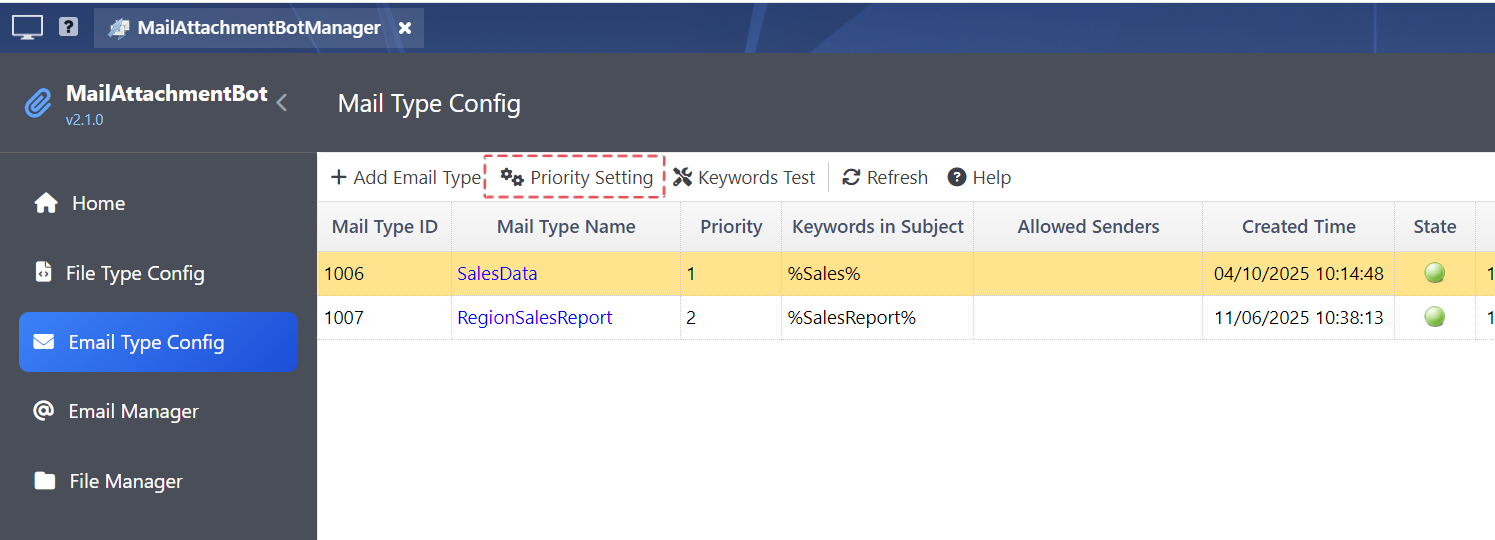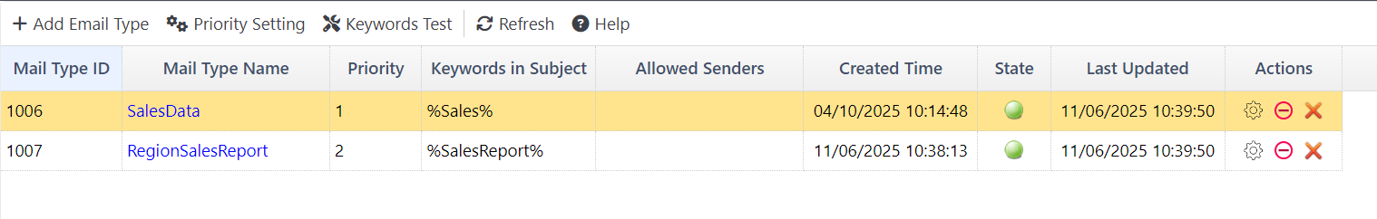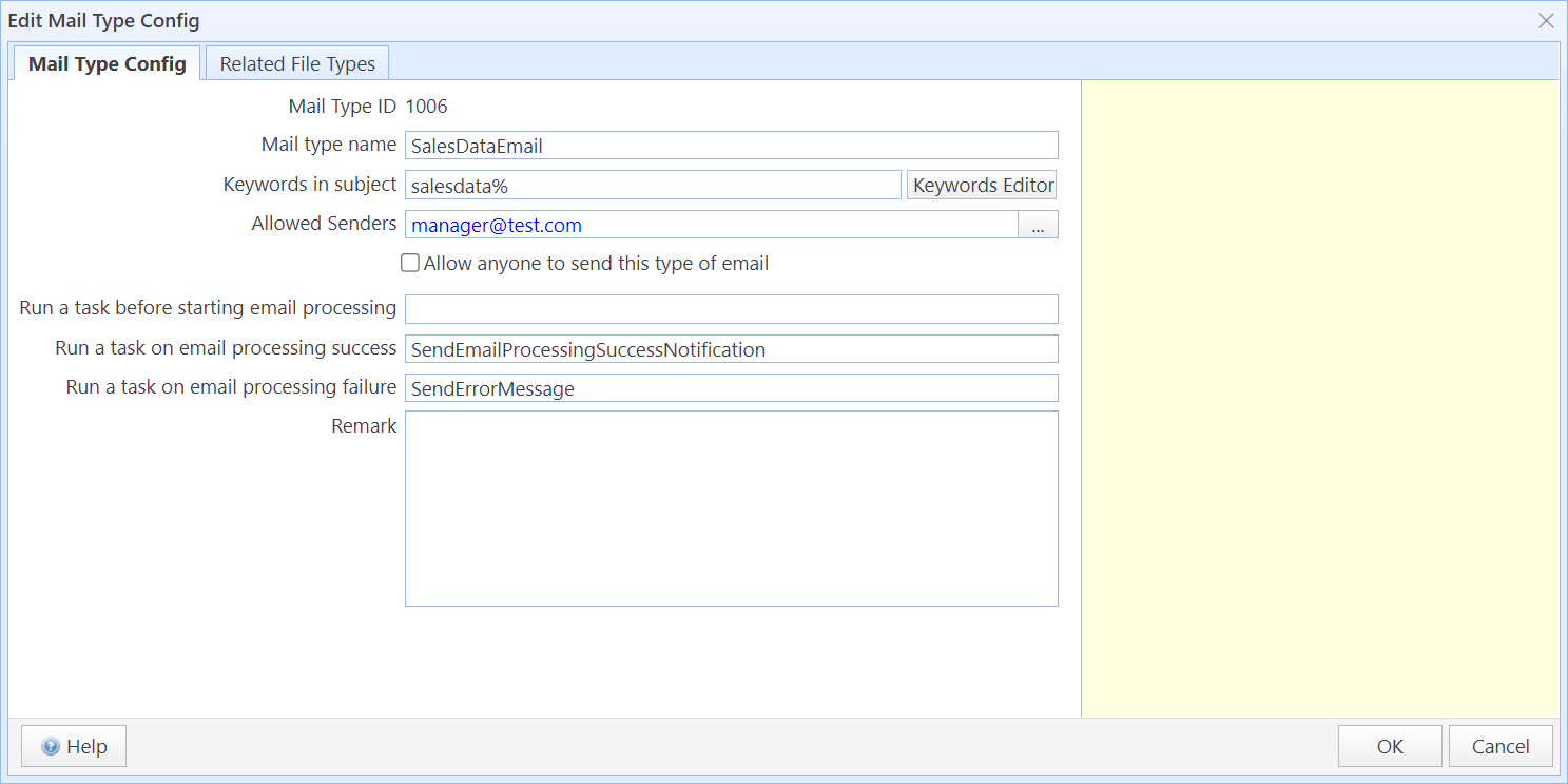 You can specify the list of related file types for each mail type in Mail Type Config. During email processing, the system first determines the email type based on the subject keyword. It then checks the attachment names using the keywords defined in Related File Types to determine the attachment’s file type.