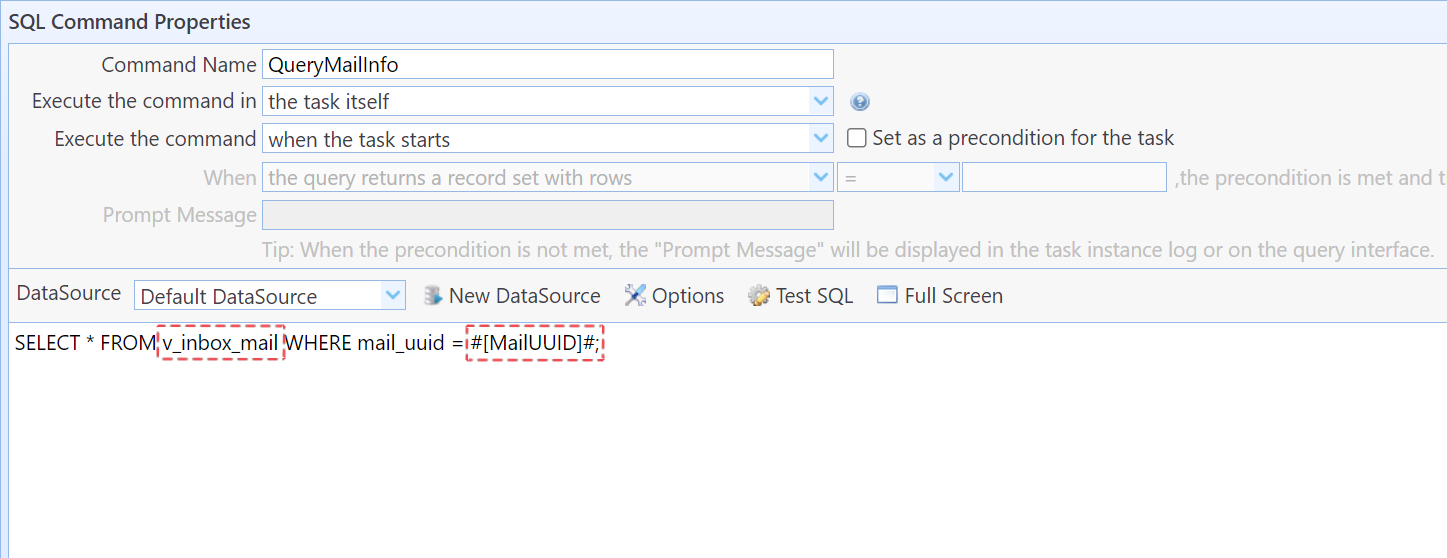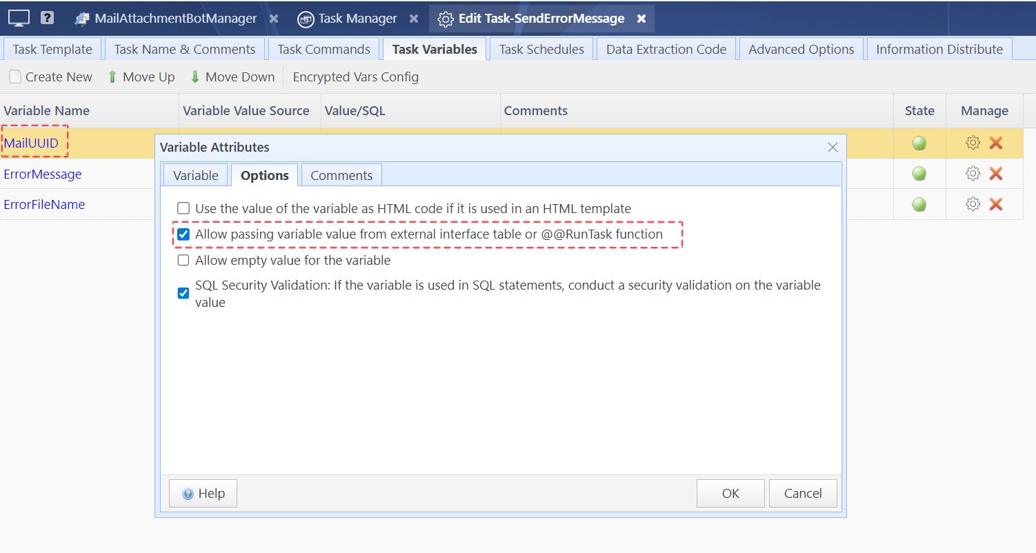 You can enter a task name here. The system will execute this task before processing emails of this type. If the task fails, email processing will be aborted. This task can include your own criteria to inspect the email, such as checking whether the sender has included duplicate attachments. The task must be of type “HTML Email” or “Text Email”, and its status must be set to Enabled. When the system executes the task, it will pass MailUUID and the email type (MailType) to your task. Therefore, your task must include variables named MailUUID and MailType, and the option “Allow passing variable value from external interface table or @@RunTask function” must be enabled for both variables on the variable options page.