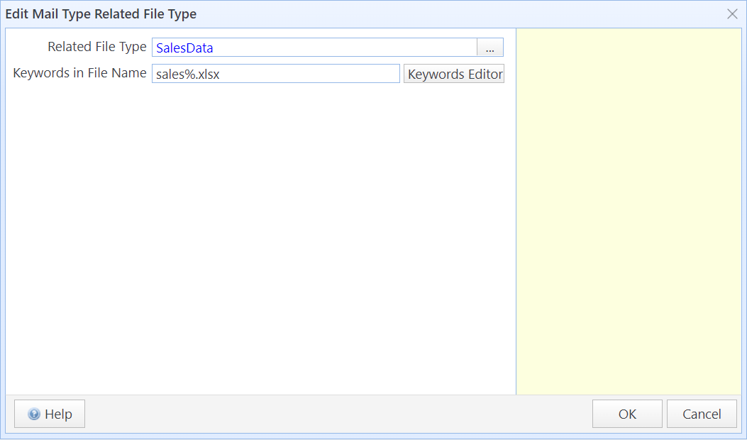You can specify which file types are associated with this email type. During email processing, the system first determines the email type based on the subject keyword. It then checks the attachment names using the keywords defined in the Related File Types configuration to determine the attachment type and how it should be processed. |