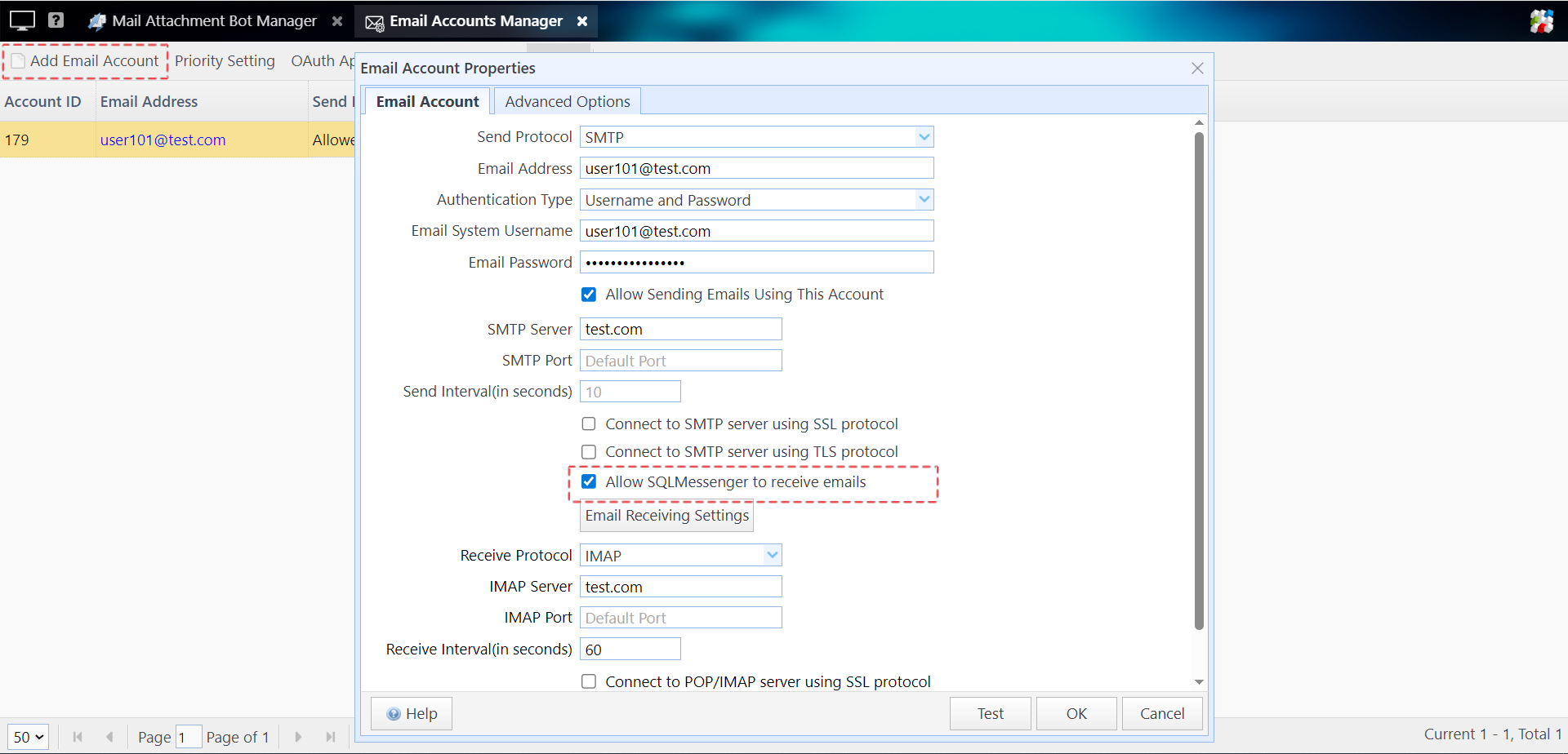 In the Email Accounts Manager, add your mailbox. When adding the account, make sure to enable the "Allow SQLMessenger to receive emails" option.