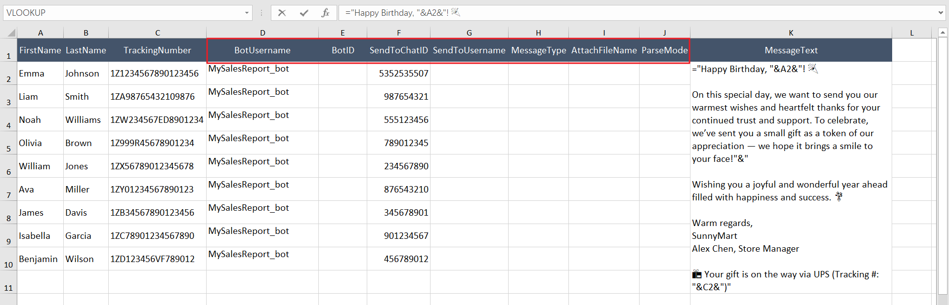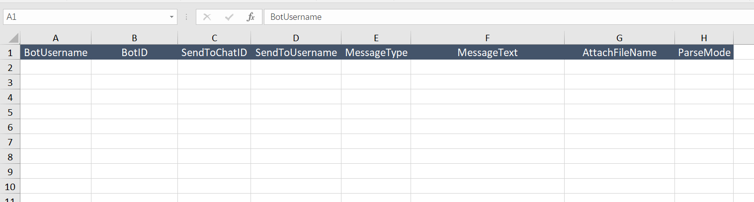 A: Yes. You can add any additional columns you need to the message list file, and you can use formulas to generate the data in the columns — for example, to generate the message content to be sent. Note that the message list must include the following columns: BotUsername, BotID, SendToChatID, SendToUsername, MessageType, MessageText, AttachFileName, ParseMode.