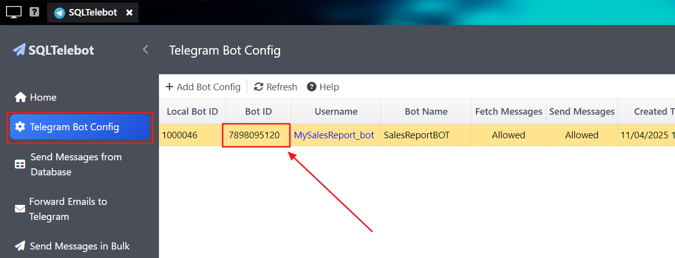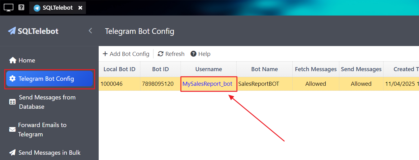 Fill in the Telegram Bot username used to send this message. Note: You only need to fill in either BotUsername or BotID — not both. The bot must already be added in the Bot Configuration section of SQLTelebot. The BotUsername can be found in the "Bot Configuration."