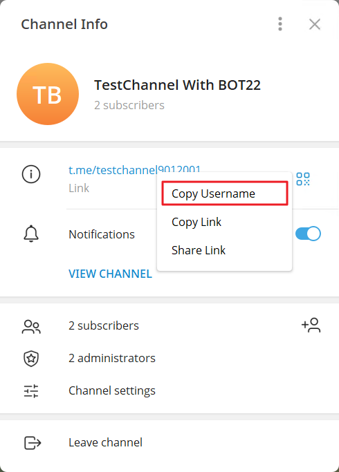 Step 2: In the "Channel Info," right-click the "link" and click "Copy username":