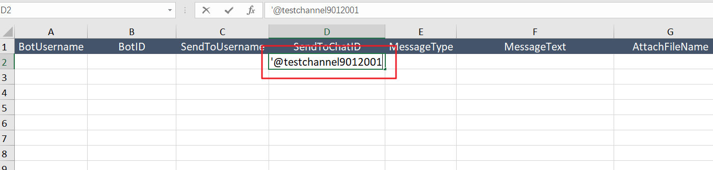 Step 3: In the message list table, paste the copied username into the "SendToChatID" cell, preceded by a single quote ('):