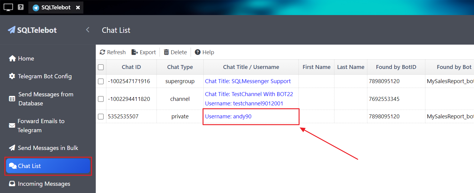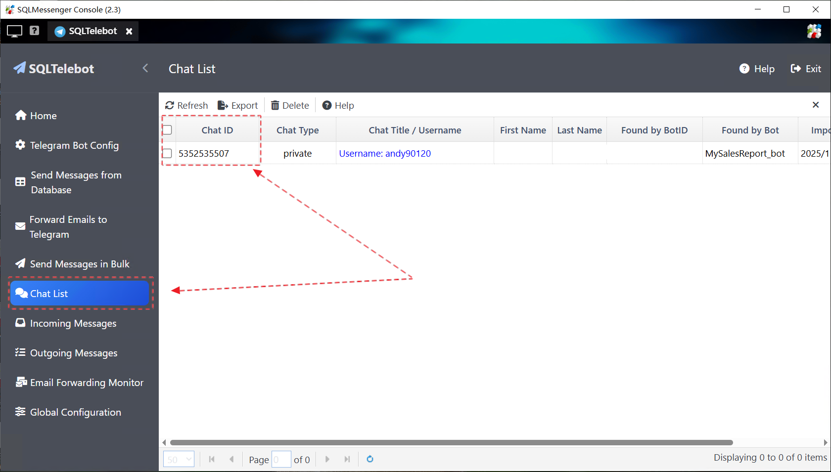 Step 3: After the message is successfully delivered, you can find the contact’s ChatID in the “Chat List” of SQLTelebot.