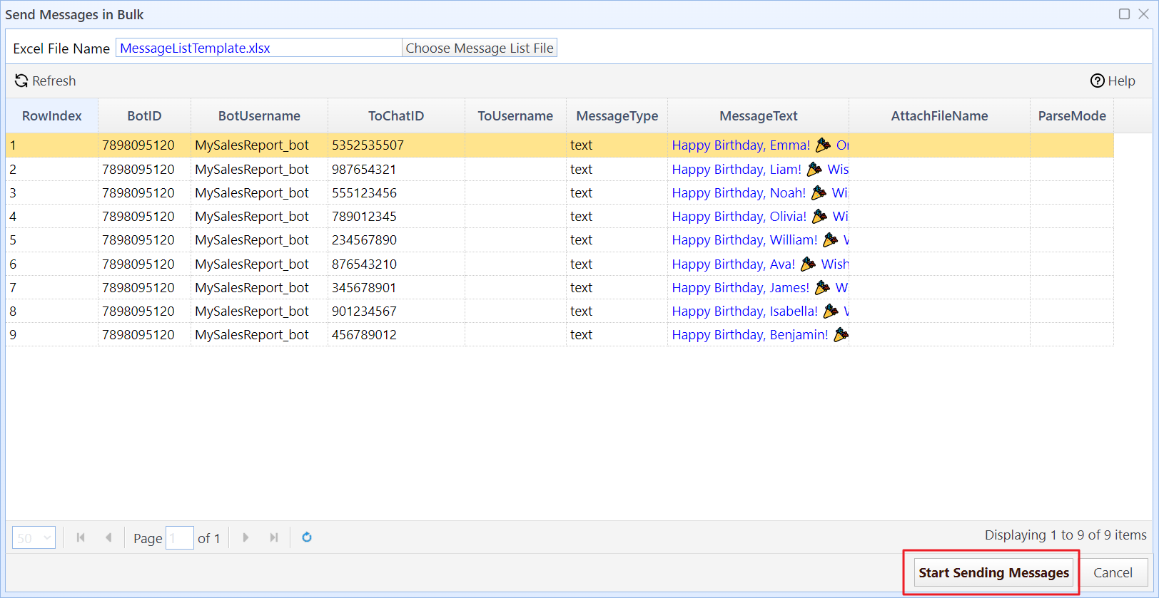 SQLTelebot provides a bulk messaging feature that enables you to prepare your messages in an Excel spreadsheet and send them to specific contacts, groups, or channels through SQLTelebot.