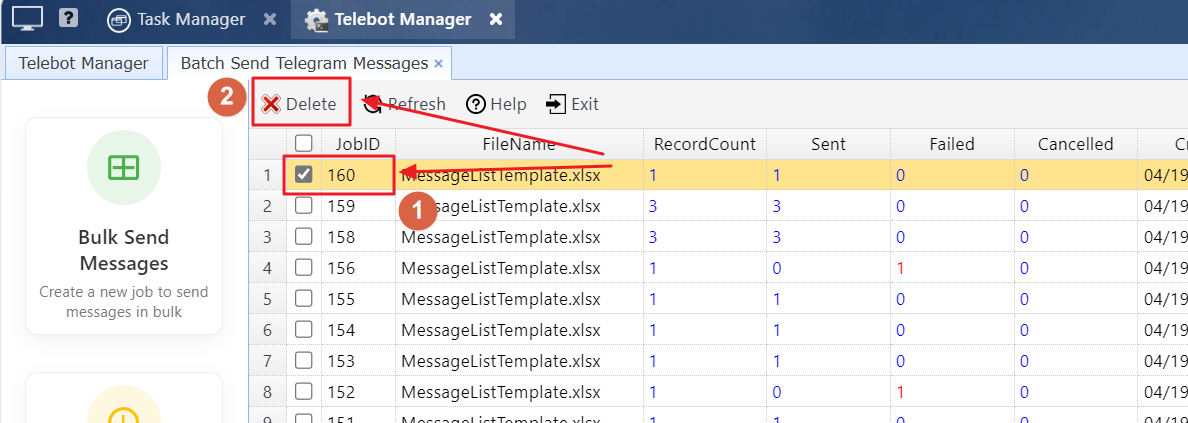After the message sending starts, you can stop the process by deleting the corresponding job in the Job List. Once the job is deleted, any unsent messages will be canceled.