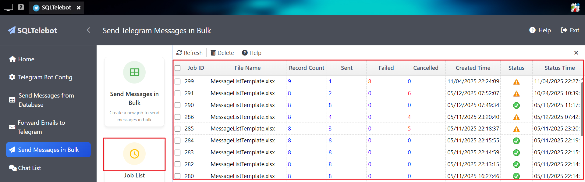 After the message spreadsheet is ready, follow the steps below to create a bulk messaging job in SQLTelebot.