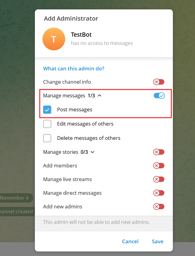 2). The bot used to send the message must be added as an administrator of the channel (it only needs the “Manage Messages” → “Post Messages” permission).