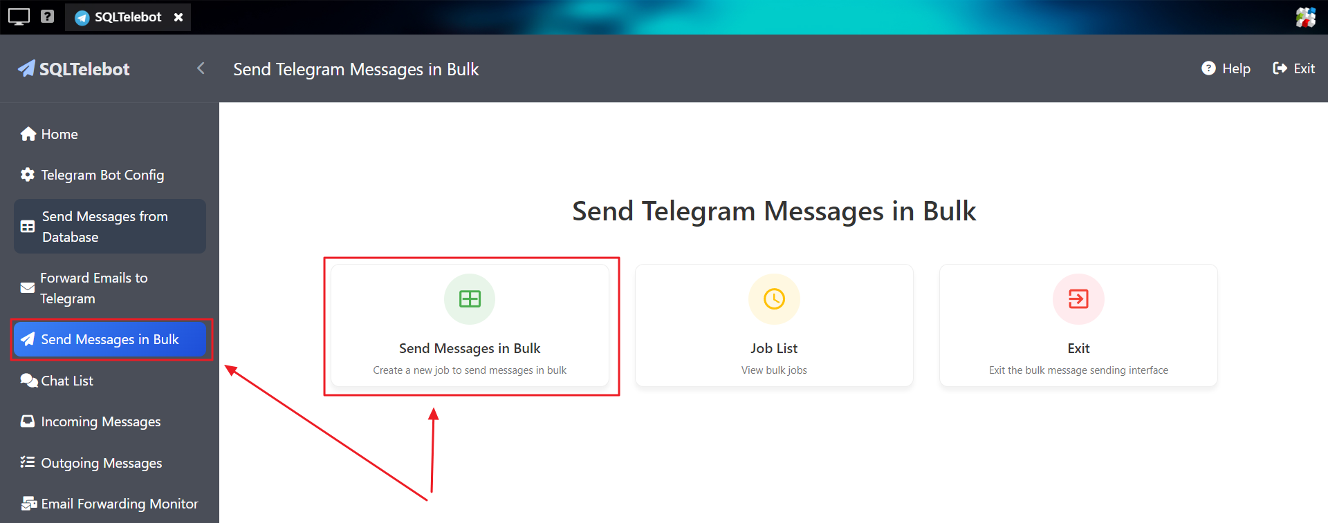 Step 1: Click the "Send Messages in Bulk" button in SQLTelebot. Then click "Send Messages in Bulk."