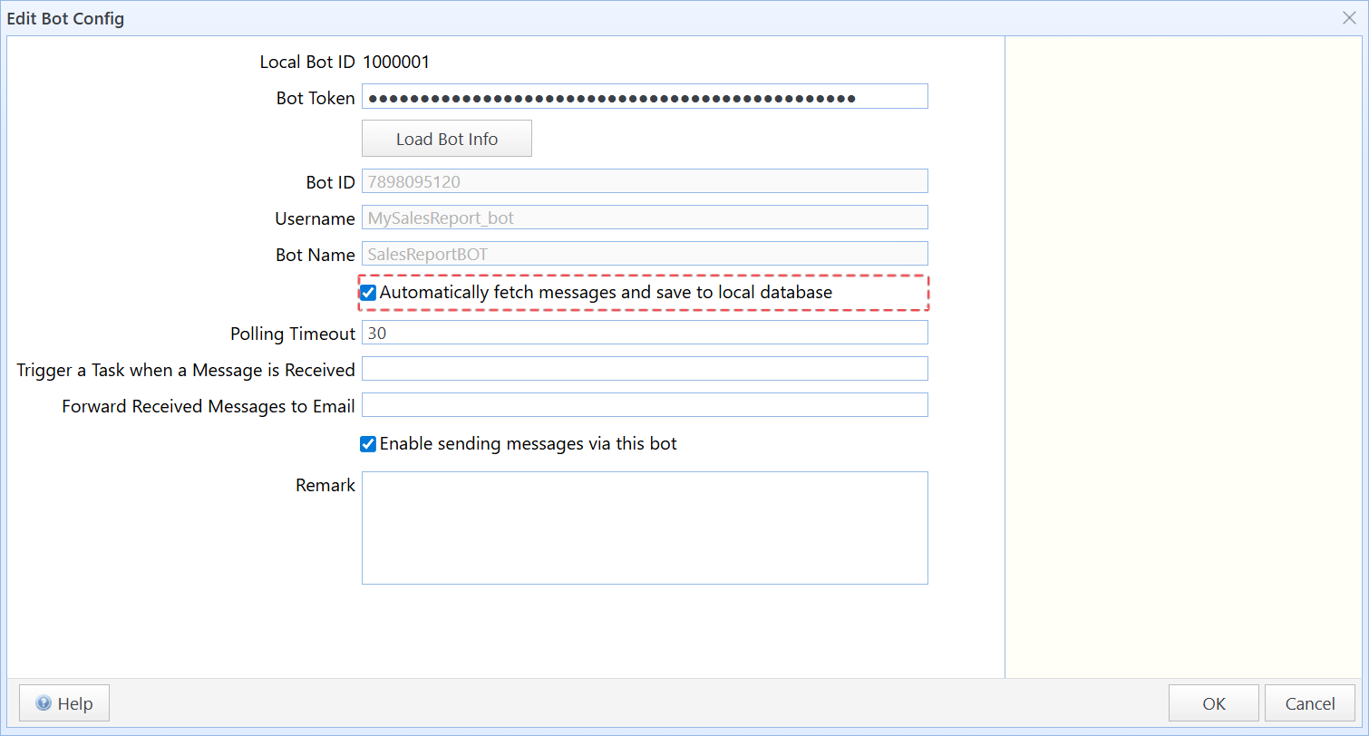 Step 1: Ensure that the bot option “Automatically fetch messages and save to local database” is enabled.