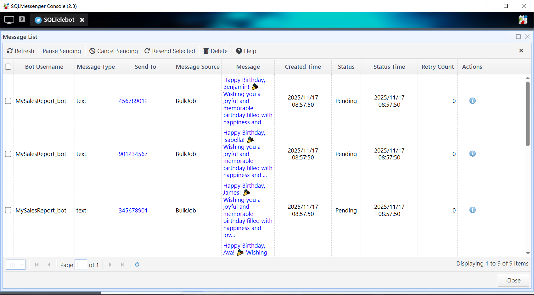 Step 4: Review the generated message list to ensure the content is correct. Once confirmed, click Start Sending Messages. SQLTelebot will then add all messages to the sending queue and begin sending them.