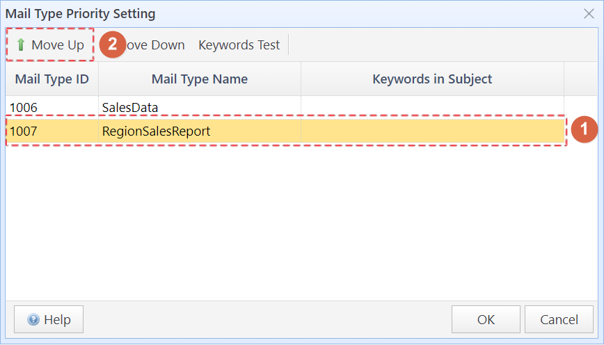 When matching file name keywords, the system will prioritize records that appear earlier in the list. To change the priority order, select the records you want to move and click the "Move Up" or "Move Down" button.