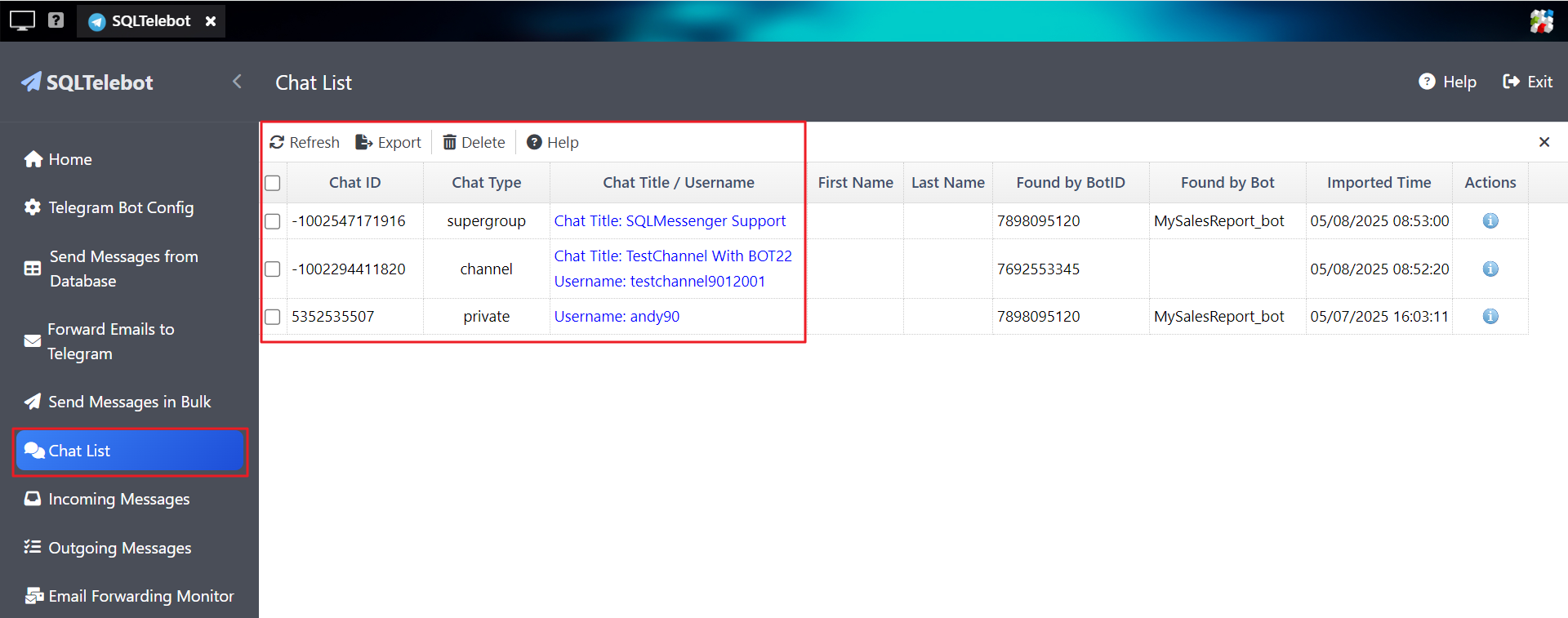 Note: The bot must receive at least one message from the contact/group/channel before they will appear in your Chat List.