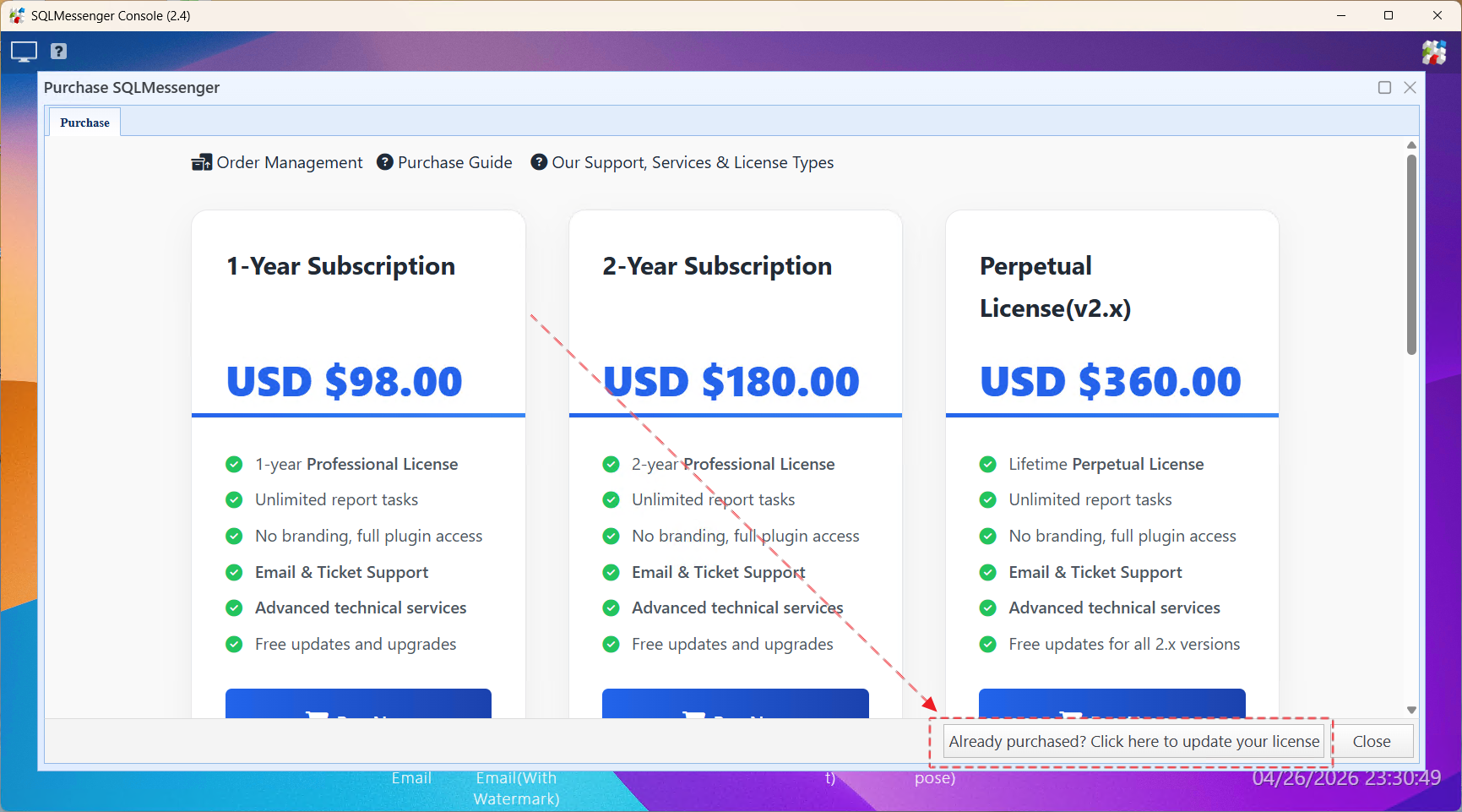 Step 2: Click the "Already purchased? Click here to update your license" button. SQLMessenger will attempt to locate your new license and update the license file automatically.