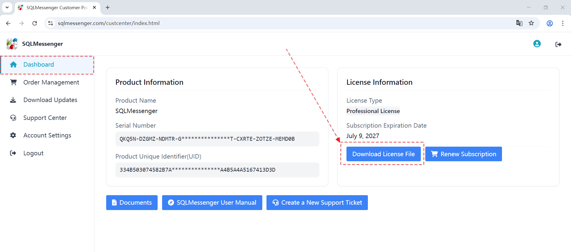 A: Please follow these steps to download and update your license file through the SQLMessenger Customer Portal.